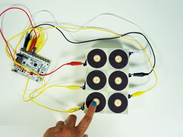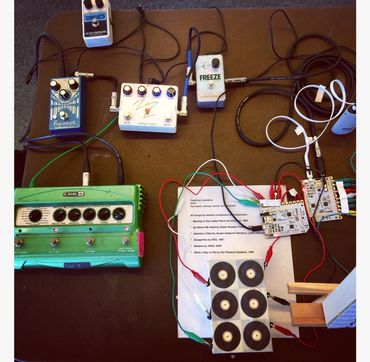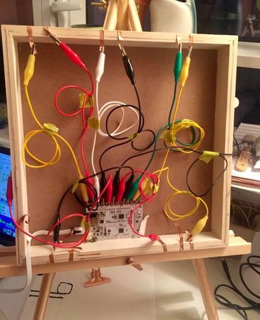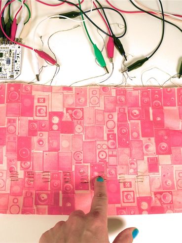 The controllers and sensor are embedded into fabric. Due to the uncertain nature and glitches of the material, it is impossible to play that riff in time, so I imagine this as an instrument to “remix” and experiment with it. Interactive installation.