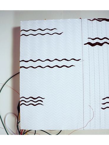 Canvas and electroconductive paint. Sounds include notes, feedback, jackhammers, distortion, and industrial sounds. Interactive installation.