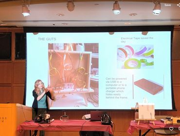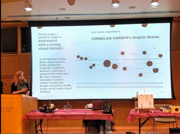 The instruments Sara builds are visually arresting creations made from fabric, wire, electroconductive thread and paint, tea towels, and a host of other diverse, easily sourced materials. These homemade synthesizers are potent vehicles for presenting contrast among ideas of gendered sound, such as delicate interfaces/components (doilies, flowers, and other objects coded as “feminine”) that produce harsh, dissonant sounds (metal pipes, amp feedback). They also showcase Sara’s wit and collective/D.I.Y. spirit—anyone can play these instruments to some degree, and they’re typically presented in a venue that encourages audience participation.